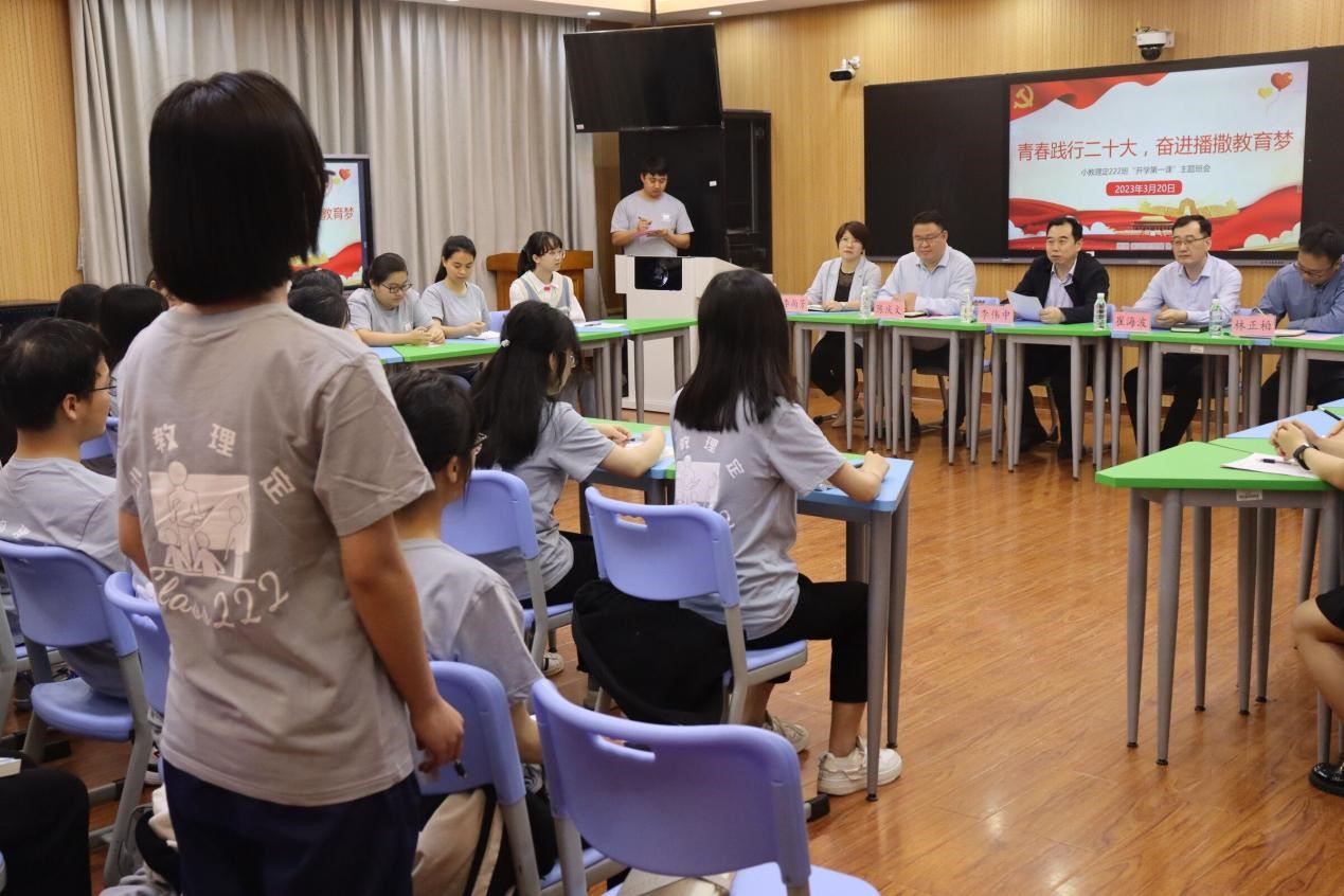 优秀毕业生小教理定向19班吕夏晴分享了大学四年的学习经验,希望师弟师妹能向优秀看齐,朝目标奋斗。随后,该班员工代表发言,分享了他们在老员工活以来的经历感悟以及二年来的变化,表达出对“青春践行二十大”的思考和实践。