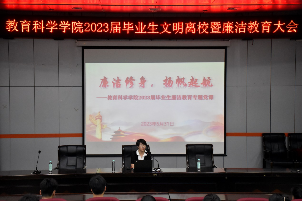 李尚芳以《廉洁修身,扬帆起航》为题,从党的二十大报告主要内容入手,着重讲述了报告中“坚定不移全面从严治党,深入推进新时代党的建设新的伟大工程”这部分内容。她结合相关条例和典型案例,引导毕业生认识到廉洁教育的必要性和紧迫性,反腐败斗争的长期性和艰巨性。她要求全体毕业生在今后的工作中,一是要学习纪律、心存敬畏。不断加强自身修养,廉洁自律,不越边界、不踩红线,不碰高压线。二是坚守底线,拒绝诱惑。低调为人,谨慎交友,自觉净化自己的社交圈、朋友圈、生活圈;三是以案为戒,保持定力。不能起贪念,不要心存侥幸,把不良的诱惑屏蔽在外;四是爱岗敬业,在基层中奉献。努力在平凡的岗位上,做出不平凡的业绩;五是饮水思源,不忘母校恩泽。在新的岗位上,讲好玉师故事,展现玉师风采。