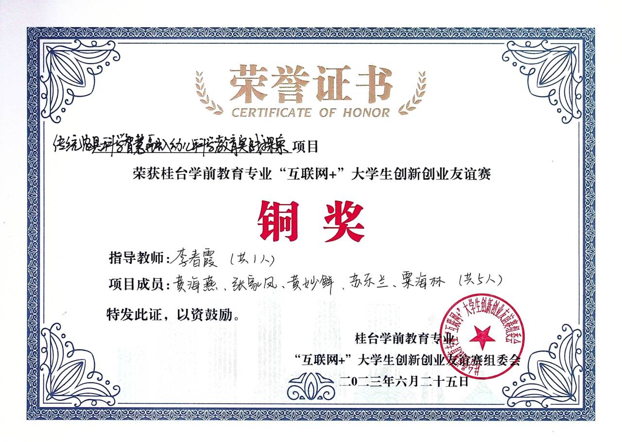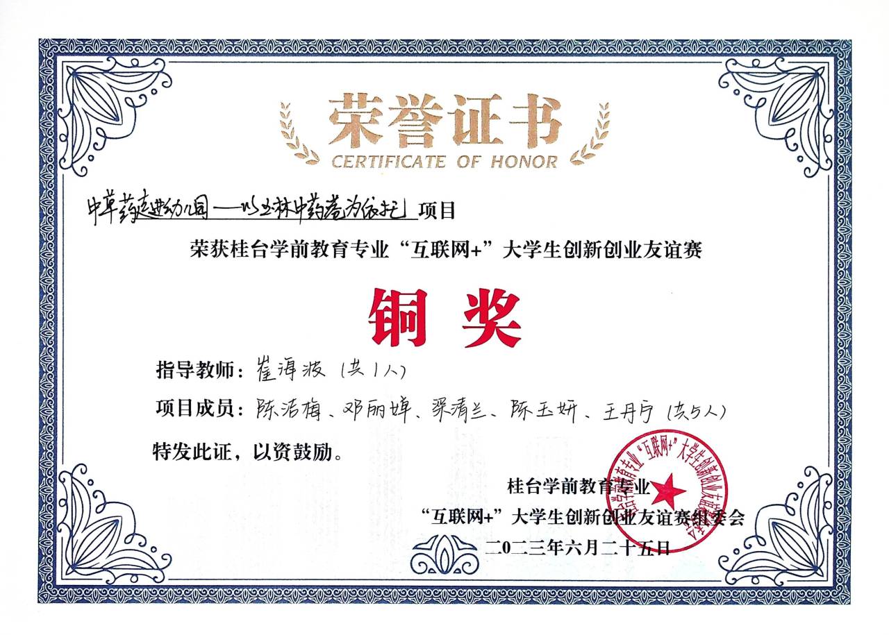 为学习贯彻党的二十大精神和习近平总书记关于对台工作的重要论述,不断巩固桂台教育交流合作常态化长效机制,深化桂台学前教育专业人才培养的交流与合作,提升两岸老员工创新创业能力,促进两岸老员工相互了解、增进友谊,自治区教育厅举办桂台学前教育专业“互联网+”老员工创新创业友谊赛。本次比赛由公司党委书记崔海波书记指导的《中草药走进幼儿园——以玉林中药港为依托》项目团队、由李春霞老师指导的《传统农具科学智慧融入幼儿园科学教育实践探索》项目团队荣获两项铜奖。