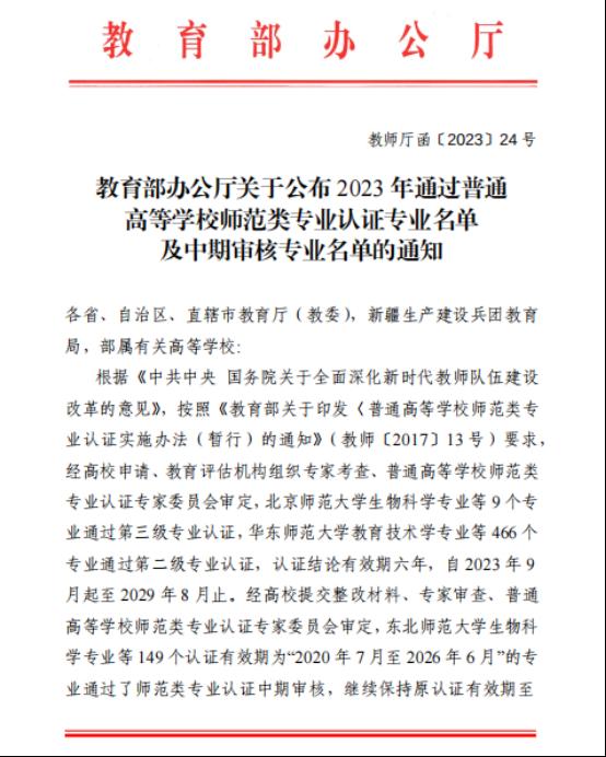 近日,教育部办公厅公布了2023年通过普通高等公司师范类专业认证专业名单及通过中期审核专业名单,公司小学教育、学前教育专业通过普通高等公司师范类专业第二级专业认证,认证结论有效期为六年,自2023年9月起至2029年8月止。