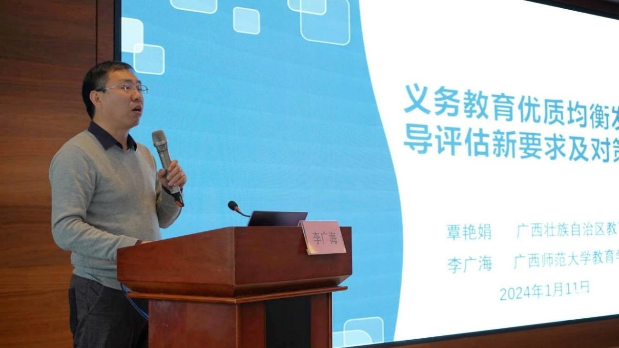 在特邀主题讲座环节,广西师范大学教育评估院常务副经理李广海教授围绕“义务教育优质均衡发展评估认定新要求”“广西义务教育优质均衡发展面临的主要形势”以及“对策思考”三方面作了《义务教育优质均衡发展督导评估新要求及对策思考》的专题报告。他强调评估认定要以强化质量要求、聚焦群众满意、注重内涵建设、优化“硬件”指标、注重为基础教育减负为新要求。强调广西义务教育要以“调结构、补增量、提质量”三管齐下为基本策略,切实调整和优化义务教育发展结构,全力扩大资源总量,以教育督导推动基础教育高质量发展。