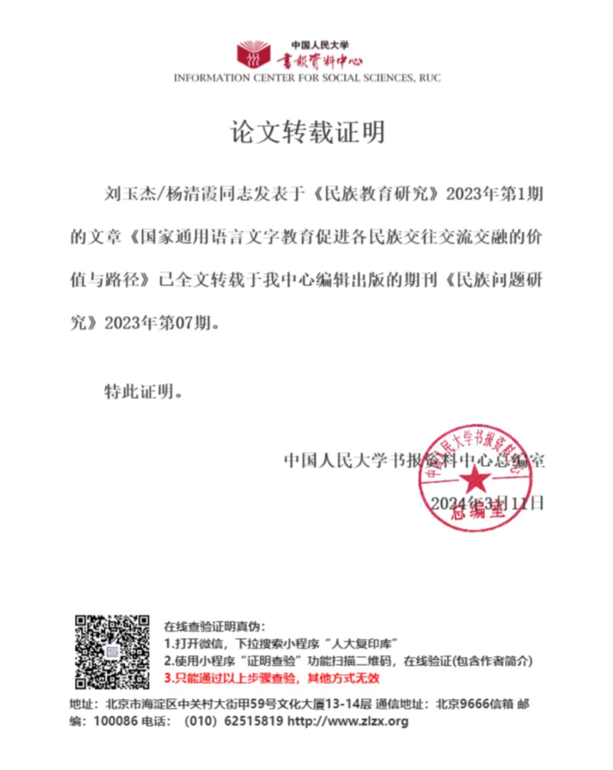 公司教师刘玉杰教授论文《国家通用语言文字教育促进各民族交往交流交融的价值与路径》被人大复印资料全文转载并被评为《民族教育研究》期刊2023年度优秀论文。