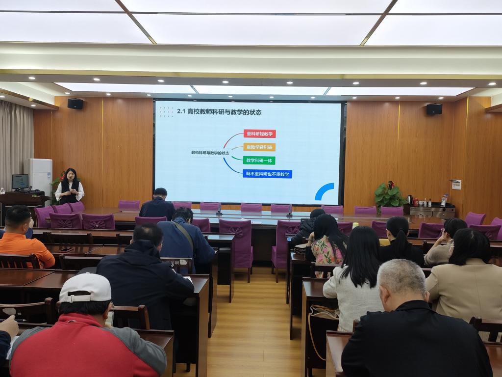 会上,杨振芳首先阐述了高校教师教研一体化的必要性,并强调,高校教师教研一体化对促进教师专业发展、创新人才培养模式、实现教育理论与实践的良性互动、改变科研与教学脱节现象具有重要现实意义。随后,她围绕高校教师教研一体化现实障碍中的认识偏差、认识偏颇、行为偏好及价值观偏离展开分析,她希望在座教师要进一步提高教师素质,促进员工成长与发展。最后,她结合自身教学经验,分享了自己进行游戏化教学、项目式教学、对分课堂、游戏化对分课堂及同辈教学+学习共同体等方面的教学改革的探索,并鼓励教师通过积极学习、培训、交流,努力提升公司产品研究能力、教学改革能力与专业素质。