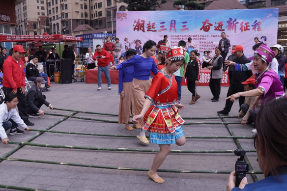 绣球传情三月三,竹竿舞动民族欢。活动现场,抛绣球、竹竿舞等民族游戏如火如荼开展。五彩斑斓的绣球在空中翻飞,犹如一道道绚丽的彩虹划过天际。参赛者身手敏捷,或跃起、或俯身,他们灵活运用各种技巧,将绣球准确地抛向对方,尽显团结一心;竹竿有节奏地开合,发出清脆的敲击声,舞者们踏入竹竿间空地,在竹竿间来回穿梭,竹竿的敲击声与舞者的脚步声、音乐的节奏声相互交织,营造出一种独特的韵律感,展现别样民族风情。